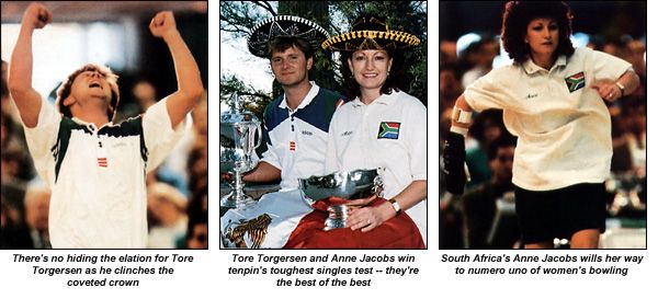 The 1994 AMF Bowling World Cup was marked with sadness, as both the mother of tournament director Bernard Gibbons and the founder of the tournament, Vic Kalman, died that week. But it spawned unparalleled joy, as well, when colorful Canadian Jack Guay rolled the first perfect game in the tournament's history. Dutch star Annemiek van den Boogaart put up the new women's single-game mark, as well: 280.